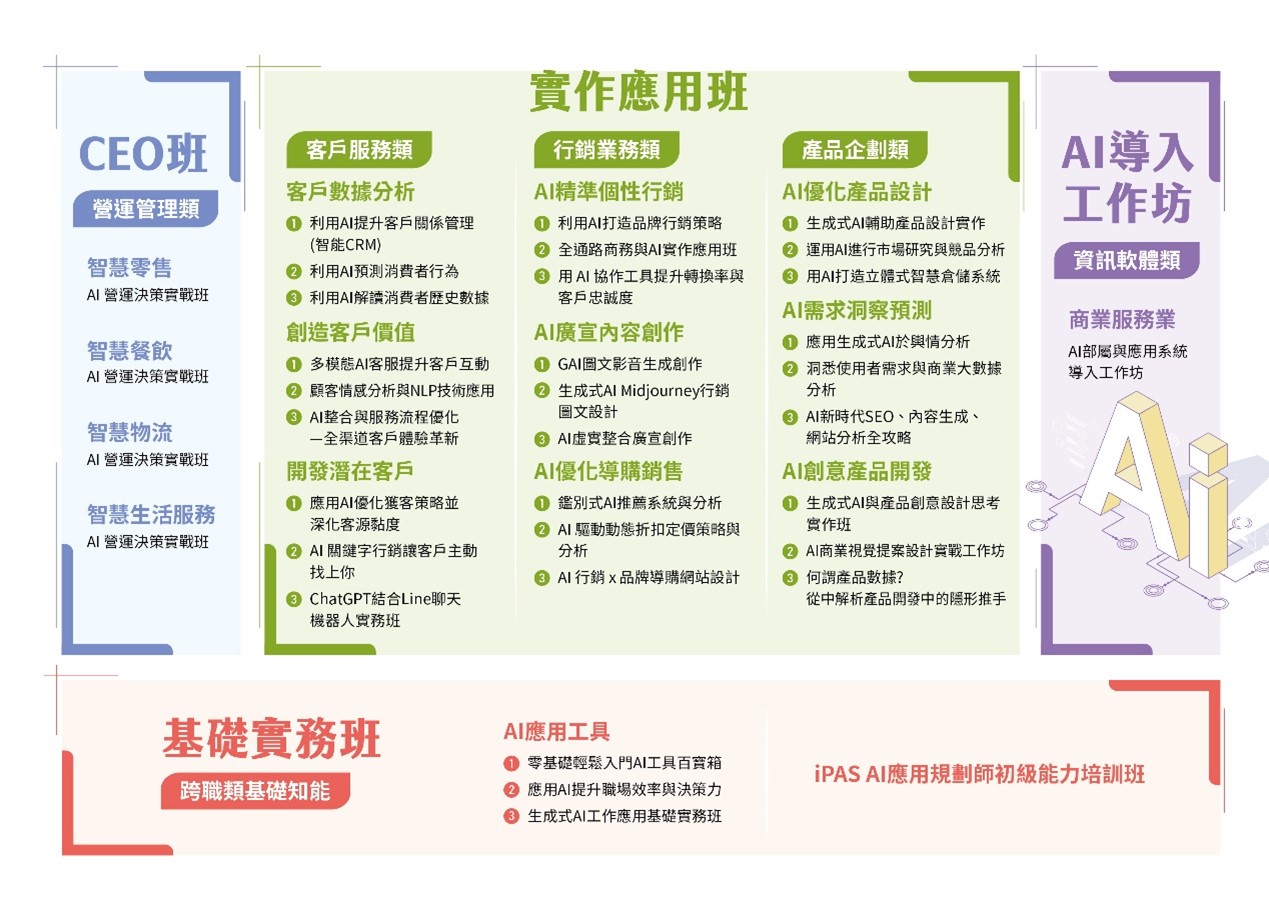 本計畫依據服務業AI應用的熱門職類,規劃五大領域的培訓課程,包括「營運管理」、「客戶服務」、「行銷業務」、「產品企劃」、「資訊軟體」以及跨職類的「AI基礎知能」。課程設計分為以下五種形式,滿足不同層級從業人員的需求: